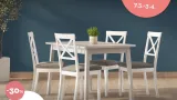 Nemojte zaboraviti blagovaonski stol i par stolica koje će upotpuniti prostor, a stilom, bojama i materijalima možete ih povezati s kutnom garniturom ili kuhinjom. Predlažemo stol Aldo i stolice Mila koji su sniženi 30% ili stol Eon po 25% manjoj cijeni i stolicama Zara sniženim 30%.