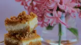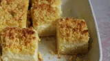 Sve sastojke za nadjev izmiksajte mikserom, a šaku grožđica (ako ih koristite) umiješajte u smjesu. Nadjev prelijte preko zapečenog tijesta i pecite 10-15 minuta, odnosno dok se nadjev ne stvrdne. Izvadite iz pećnice te preko naribajte drugi dio tijesta. Pecite još 10-ak minuta (dok ne poprimi zlaćanu boju). Kad se ispeče, pustite da se dobro ohladi. Možete posipati mljevenim brezinim šećerom.