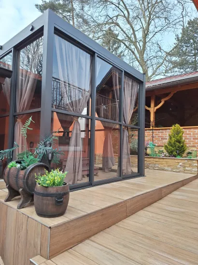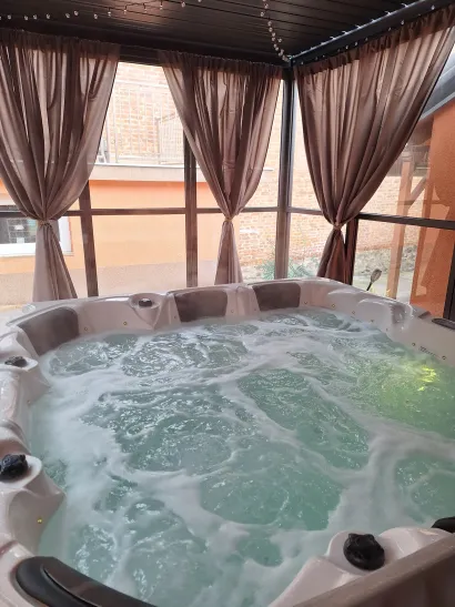 U ponudi je i vanjski grijani jacuzzi natkriven aluminijskom pergolom (preko zimskog perioda i ostakljen) te unutarnja Bio solna sauna uz koju je također tuš sa toaletom.