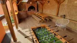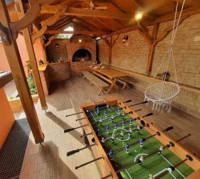 U ograđenom dvorištu bez dostupnih pogleda nalazi se natkrivena terasa sa pečenjarom i velikim stolom za ugodna druženja uz stolni nogomet.